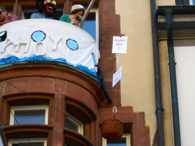 Eine wunderbare Idee haben Maja und ihr Freund: Hoch oben in der obersten Wohnung rechts vom Restaurant Schnabel, stehen sie auf dem Balkon und schicken einen Korb nach unten. Man kann Geld rein legen und eine Bestellung. Neben „Angler Bier“ gibt es Faschte-, Kääs- und Ziibelewaje, und zwar hausgemacht, wie Maja mit schriller Stimme von oben auf die Strasse schreit. Und echt jetzt: Das funktioniert. Und zwar seit Jahren. Und sowas bekommt man eben nur sehr schwer mit, wenn man als Routenfasnächltler unterwegs ist….